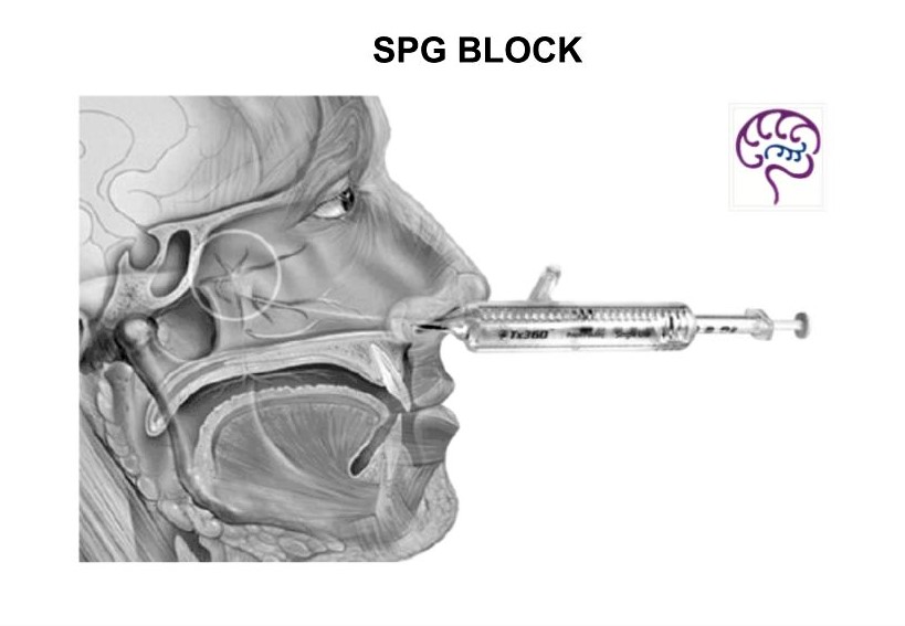 A Sphenopalatine Ganglion Block (SPG block) is a procedure that delivers an anesthetic agent or numbing medicine to a collection of nerves for the purpose of stopping pain signals to the brain.